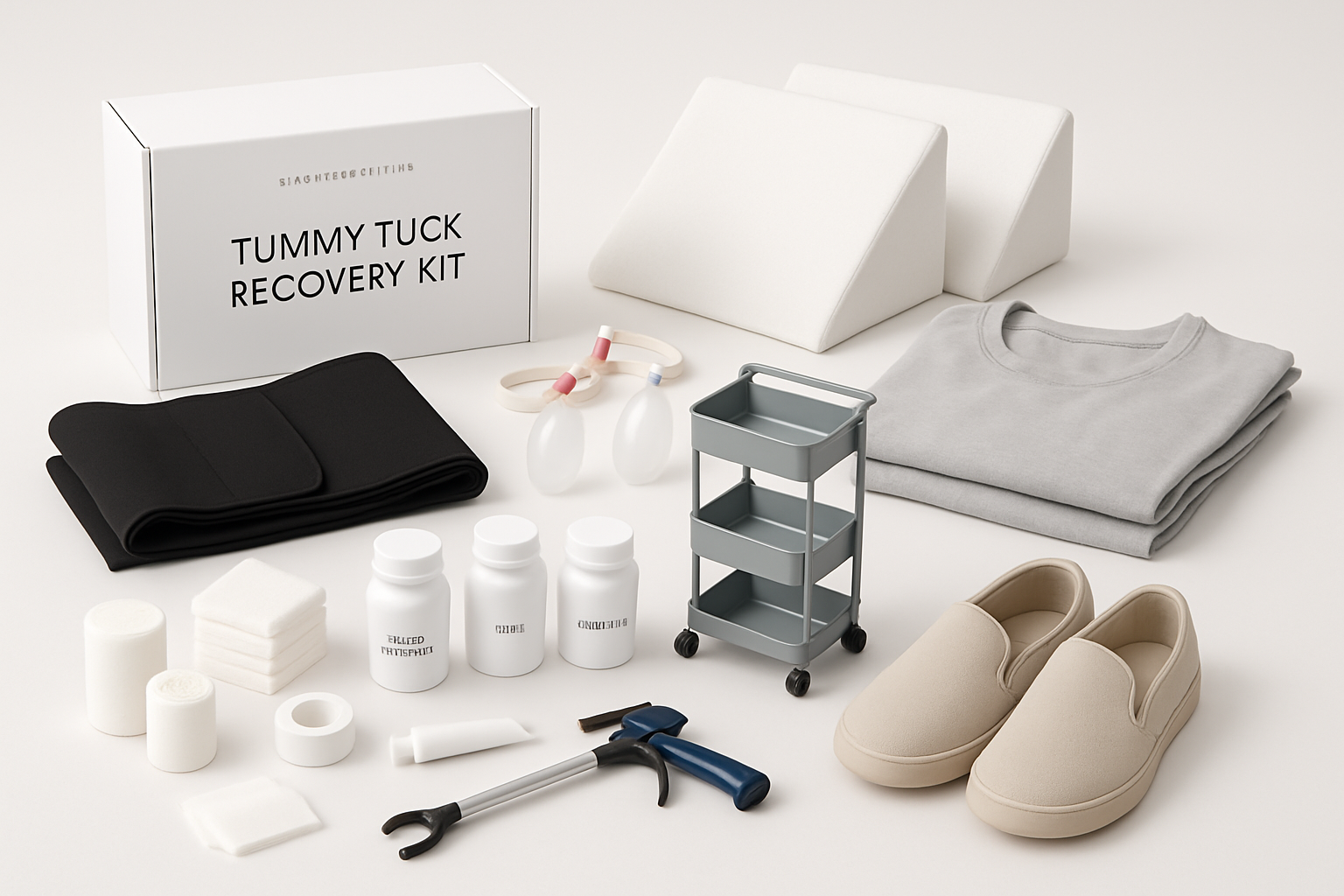 Comprehensive abdominoplasty recovery package featuring medical-grade compression binders and mobility aids for optimal post-surgical healing. This specialized kit supports patients through the challenging 6-8 week recovery period with professional wound care and comfort essentials.